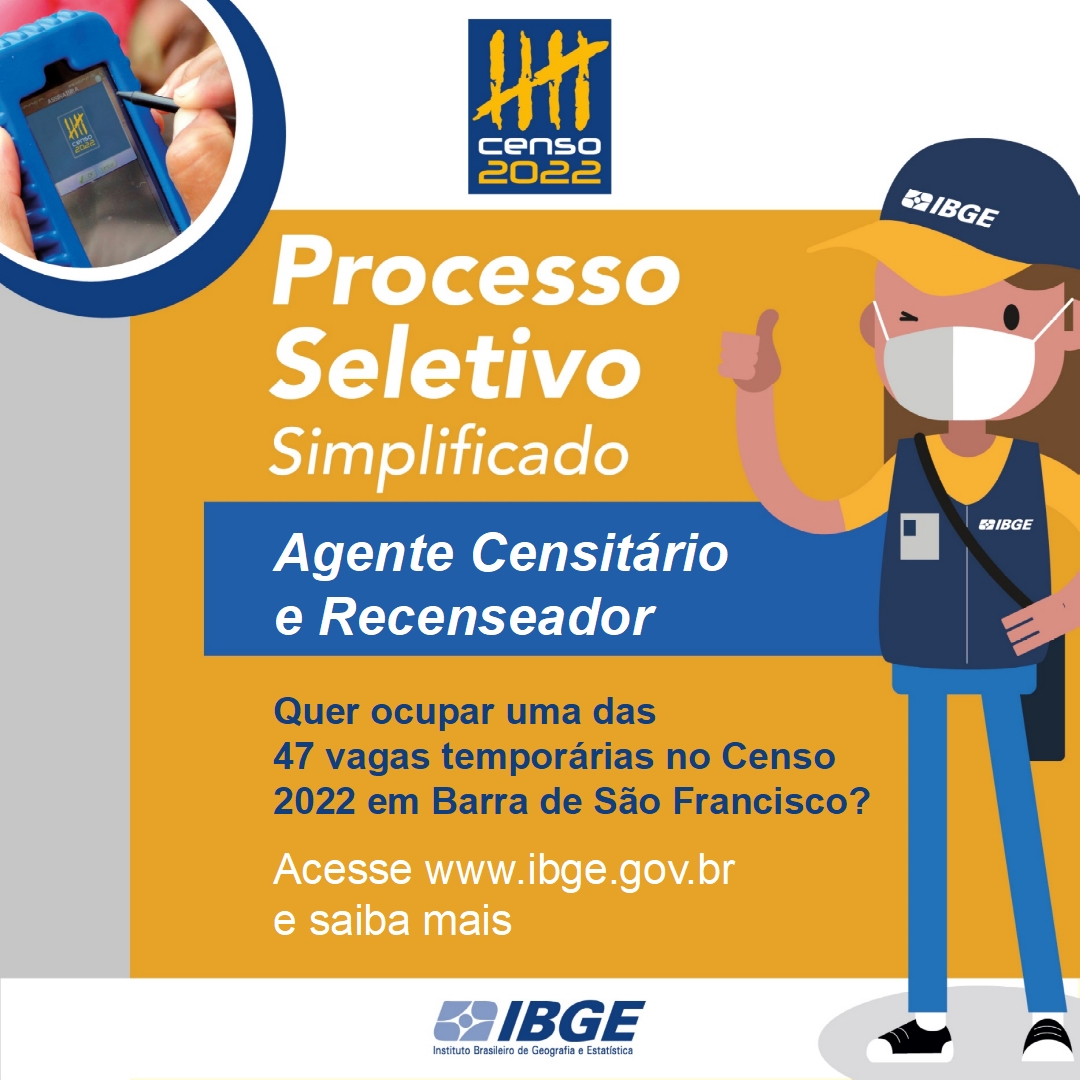 Os candidatos a recenseador serão selecionados por uma prova objetiva, de caráter eliminatório e classificatório, com 10 questões de Língua Portuguesa, 10 questões de Matemática, 5 questões sobre Ética no Serviço Público e 25 questões de Conhecimentos Técnicos. A prova será aplicada no dia 27/03/2022.