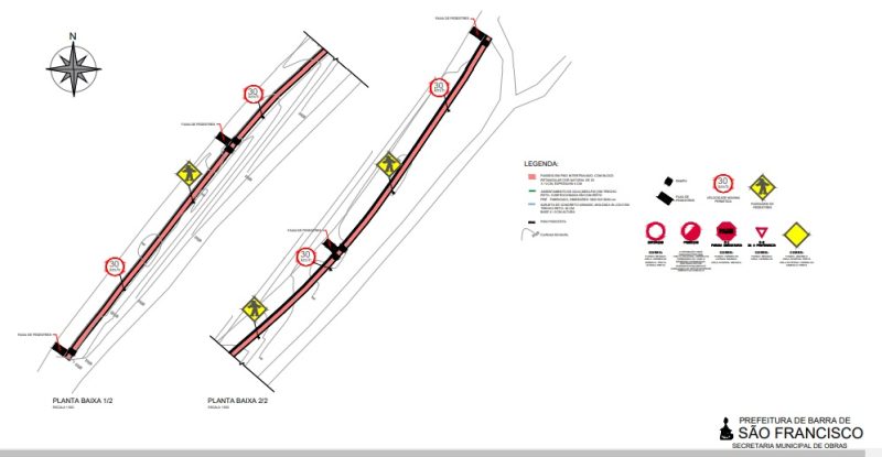 A pista de rolamento será constituída de blocos de concreto retangulares 20 x 10 cm, com implantação das placas de sinalização vertical e pintura de faixas para sinalização horizontal.