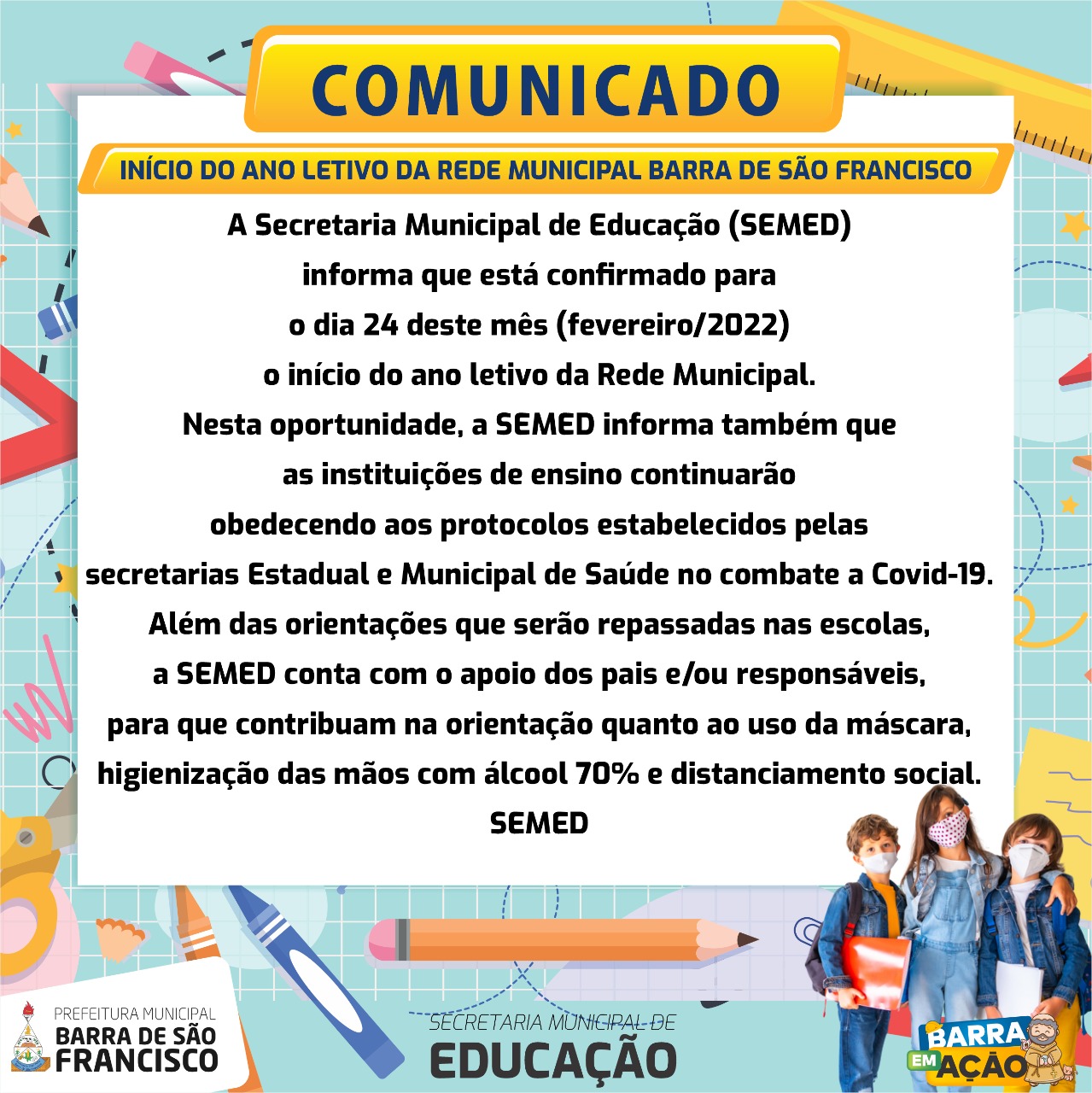 Terá início nesta quinta-feira (24) o ano letivo da Rede Municipal de Barra de São Francisco. A data foi definida no dia 31 de janeiro após realização de audiência pública, no plenário da Câmara Municipal, quando educadores da Secretaria Municipal de Educação (SEMED), pais de alunos e demais representantes da sociedade manifestaram, através de voto, opinião.