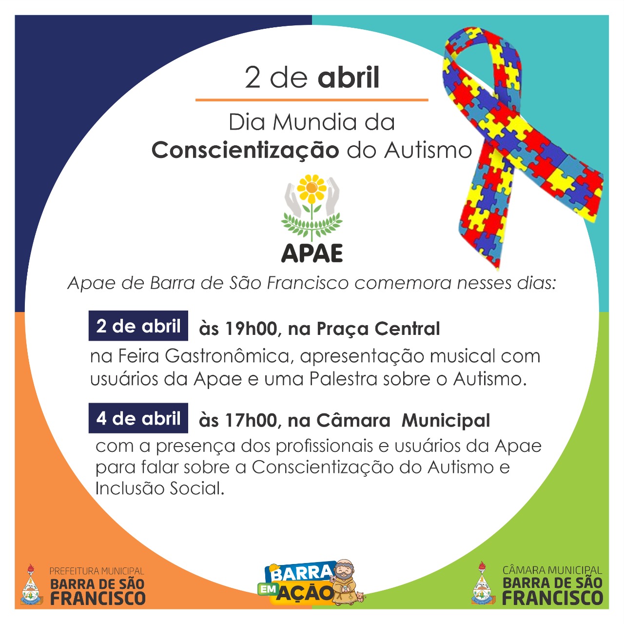 O Dia da Conscientização do Autismo, comemorado anualmente no dia 2 de abril, será comemorado pela Associação de Pais e Amigos dos Excepcionais (APAE) de Barra de São Francisco com diversas ações. No dia 2, sábado, às 19 horas, terá apresentação musical dos alunos da Apae Antônio Lucas Alves da Silva e Manoel Joaquim Gomes, o Maninho, na Praça Municipal Arlindo Pinto da Costa, e em seguida uma palestra ministrada pelo psicopedagogo Bruno Ragetelles com o tema autismo.