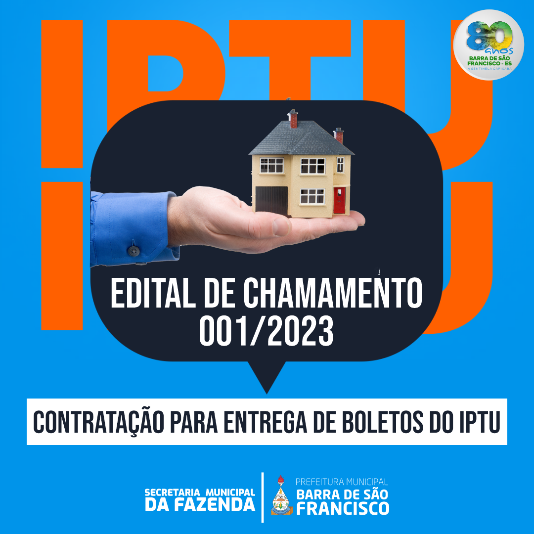 A Prefeitura Municipal de Barra de São Francisco, por meio da Secretaria Municipal da Fazenda (SEMFA), abriu o edital de chamamento público para a contratação excepcional para jovens acima de 18 anos, que irão atuar na campanha “IPTU PREMIADO 2023” para a distribuição dos boletos do IPTU deste ano, em toda a sede e distritos do município.