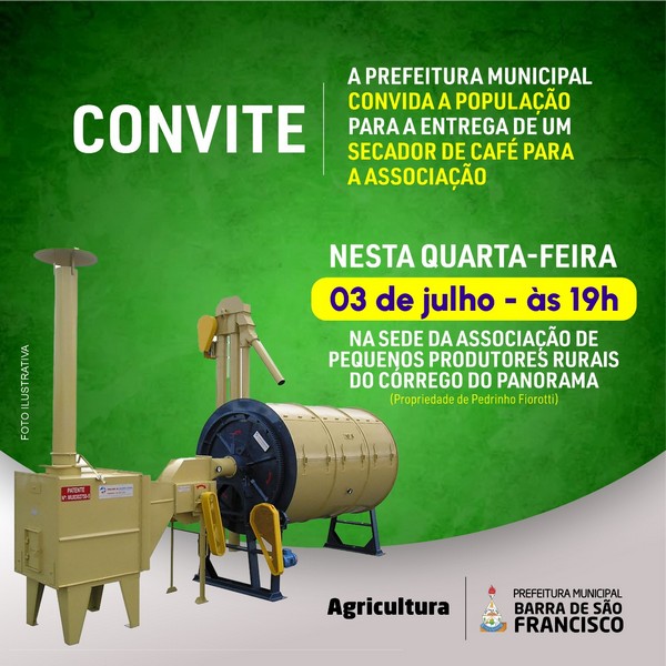 A Prefeitura realizará, por meio da Secretaria Municipal de Agricultura, a entrega de um secador de café à Associação de Pequenos Produtores do Córrego Panorama em distrito Paulista. A cessão será realizada às 19 horas desta quarta-feira (03), na sede da associação, localizada na propriedade do presidente da instituição, Pedro Antônio Fiorotti.
