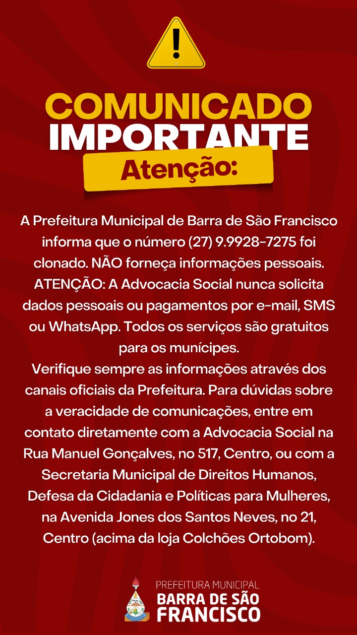 A Prefeitura Municipal de Barra de São Francisco alerta os usuários da Advocacia Social e toda a comunidade francisquense que o número (27) 9.9928-7275 foi clonado. Portanto, NÃO forneça quaisquer informações ou dados pessoais.