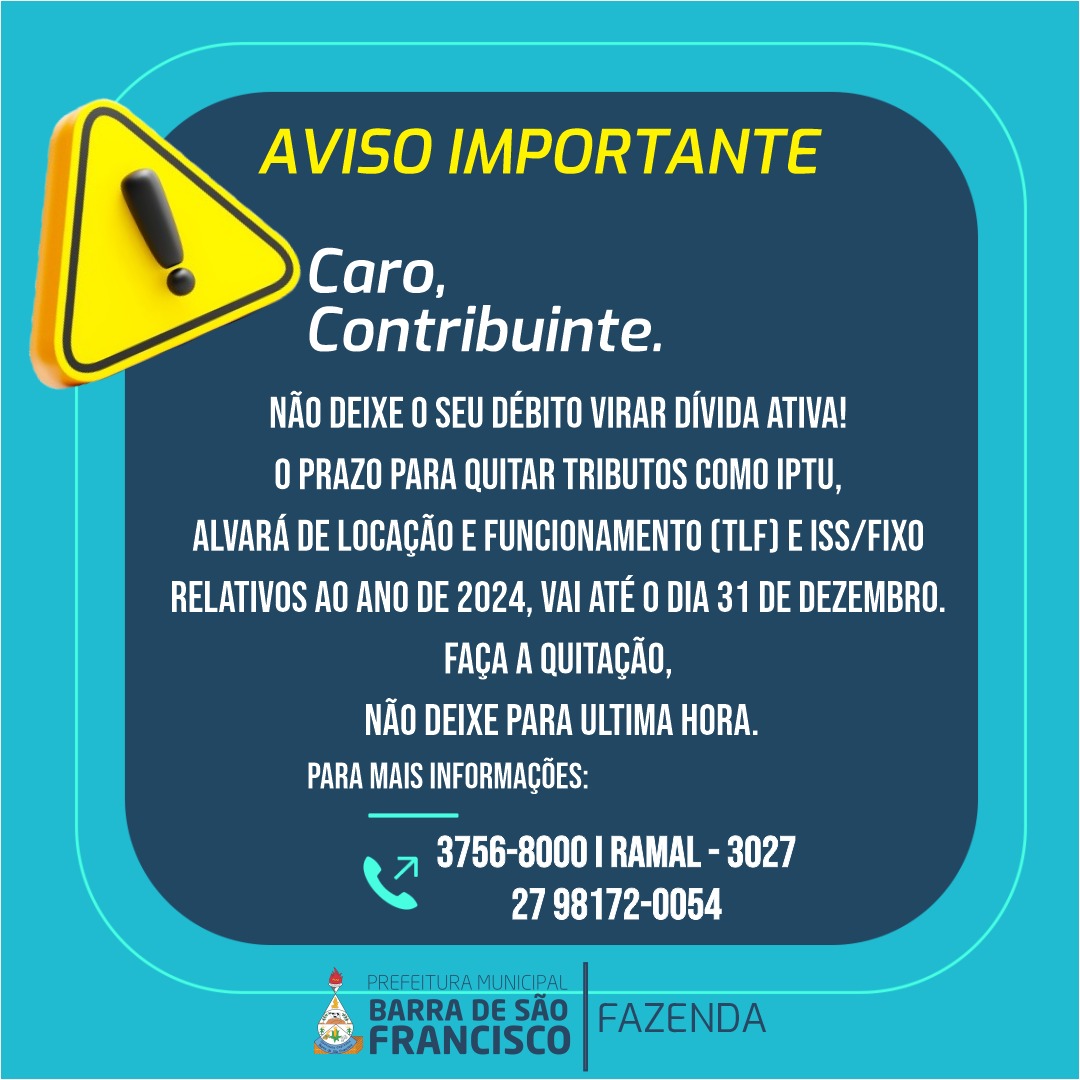 A Prefeitura Municipal de Barra de São Francisco alerta os contribuintes e munícipes francisquenses para acertarem, o mais breve possível, as pendências junto à Secretaria Municipal da Fazenda (Semfaz) relativas ao ano de 2024, como: Imposto sobre a Propriedade Territorial Urbana (IPTU), Imposto sobre Serviços (ISS), Imposto de Transmissão de Bens Imóveis (ITBI), Alvará de Localização e Funcionamento (TLF), multas, etc. O prazo para quitar os tributos vai até o dia 31 de dezembro deste ano (2024). Não deixe para a última hora. Evite que seu débito se transforme em dívida ativa, causando transtornos com custas de protesto (taxa cobrada pelo cartório para regularizar a situação).