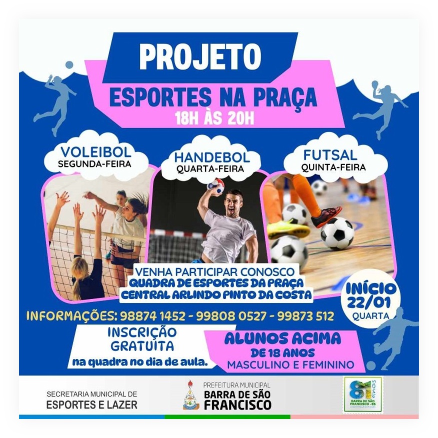 A Prefeitura Municipal de Barra de São Francisco, por meio da Secretaria Municipal de Esportes e Lazer, lança nesta quarta-feira (22), o projeto "ESPORTES NA PRAÇA". O principal objetivo do projeto é proporcionar aos adolescentes e adultos a oportunidade de praticar esportes nas modalidades de handebol, futsal e voleibol, promovendo a integração social e o bem-estar saudável por meio da atividade física.