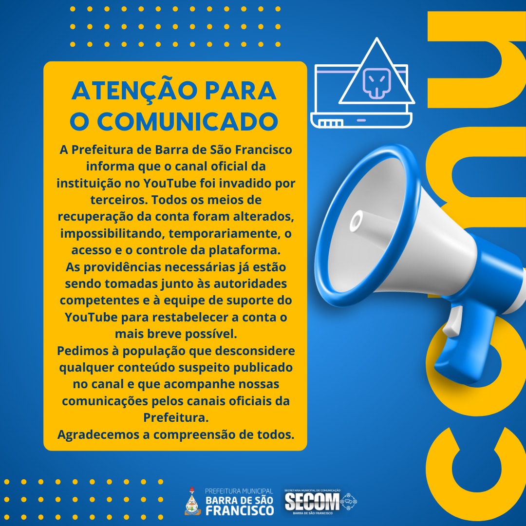 Nos últimos dias, os invasores realizaram publicações não autorizadas, incluindo conteúdos que não representam o trabalho da (SECOM) Secretaria Municipal de Comunicação. Pedimos que desconsiderem qualquer postagem feita na conta comprometida.