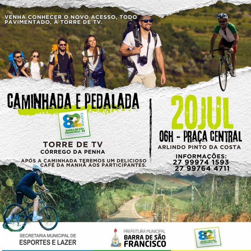 A Prefeitura de Barra de São Francisco convida toda a população para participar da “Caminhada e Pedalada 82 Anos”, que será realizada neste domingo, 20 de julho, com saída às 6h da manhã, na Praça Central. O percurso seguirá até a área das torres de transmissão, um dos pontos mais altos e com vista privilegiada da cidade.