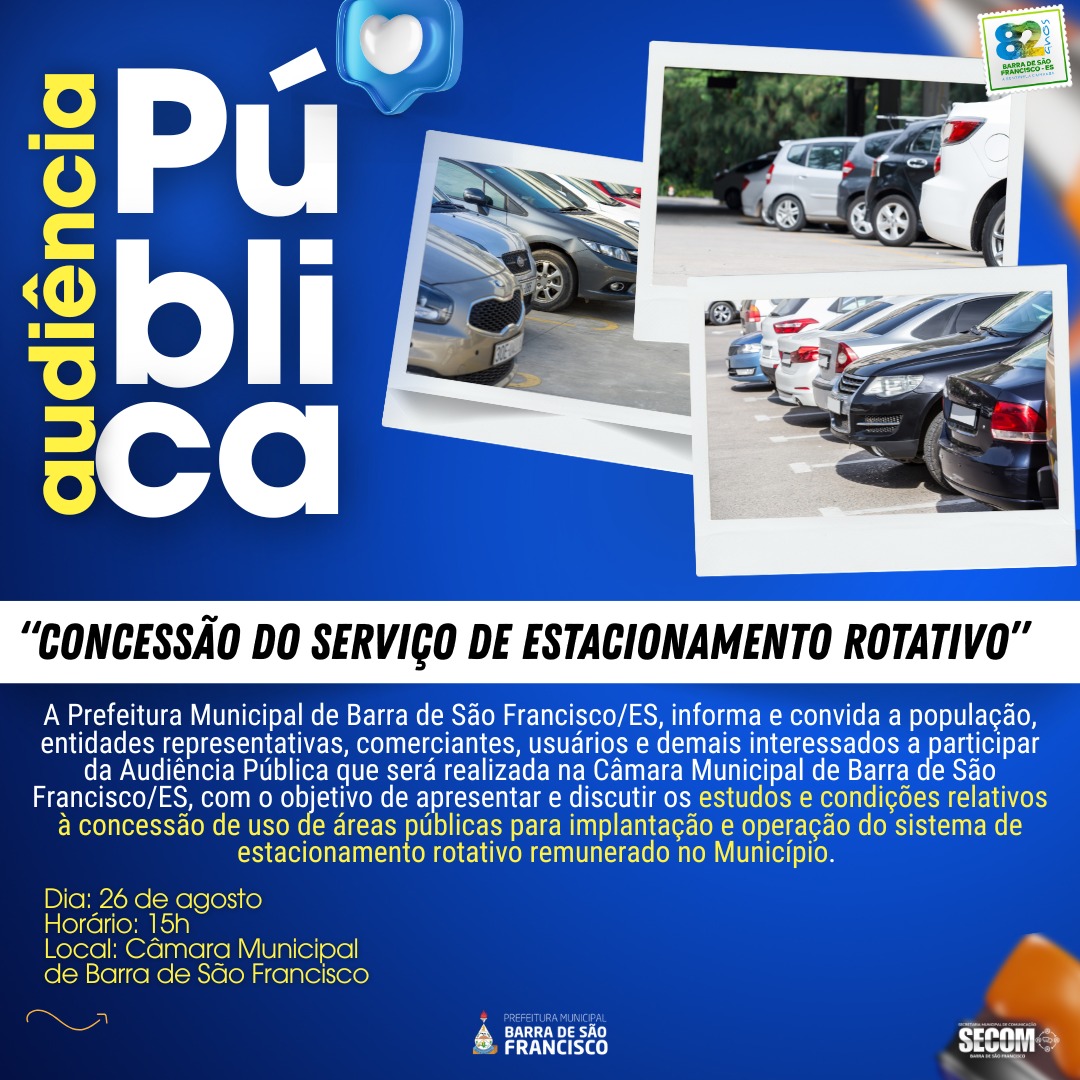 A Prefeitura de Barra de São Francisco convida a população, comerciantes e demais interessados para uma audiência pública sobre a concessão do serviço de estacionamento rotativo no município.