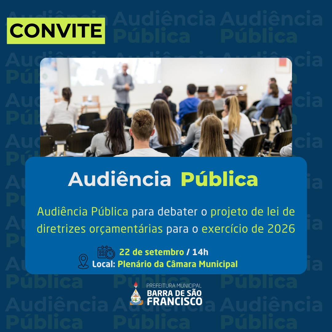 A Prefeitura de Barra de São Francisco convida a população para participar da audiência pública sobre o projeto de Lei de Diretrizes Orçamentárias (LDO) para o exercício de 2026. O encontro será realizado no dia 22 de setembro, às 14 horas, no plenário da Câmara Municipal, localizada no bairro Irmãos Fernandes.