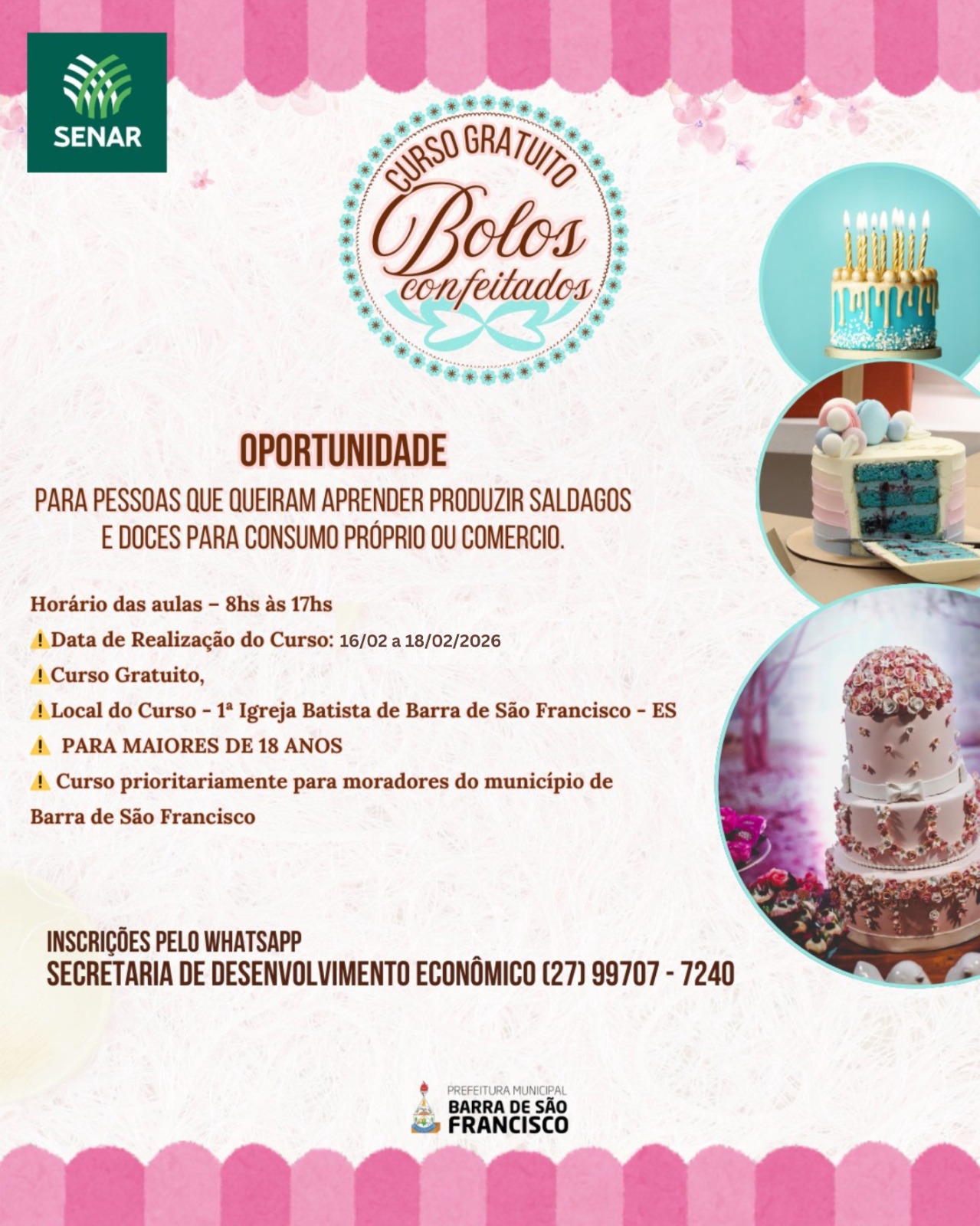 A Prefeitura de Barra de São Francisco, por meio da Secretaria Municipal de Desenvolvimento Econômico e Geração de Empregos, em parceria com o Serviço Nacional de Aprendizagem Rural (Senar), vai realizar o Curso Gratuito de Bolos Confeitados, voltado à capacitação de pessoas interessadas em aprender técnicas de confeitaria para consumo próprio ou para geração de renda.