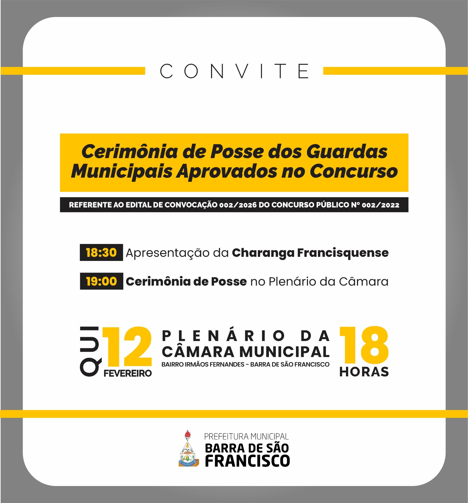 Na próxima quinta-feira (12), um novo reforço na segurança municipal será oficializado: um total de 11 Guardas Civis Municipais aprovados no concurso público tomarão posse em cerimônia marcada para ocorrer às 19h, no plenário da Câmara Municipal de Barra de São Francisco. A convocação foi publicada oficialmente pela Prefeitura por meio do Edital nº 002/2026, referente ao concurso de 2022.