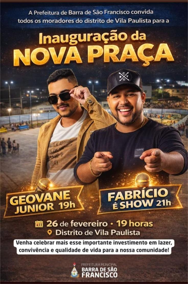 A Prefeitura de Barra de São Francisco convida a população do distrito de Paulista e região para a inauguração da nova praça da comunidade, que será realizada na quinta-feira, 26 de fevereiro, às 19 horas.