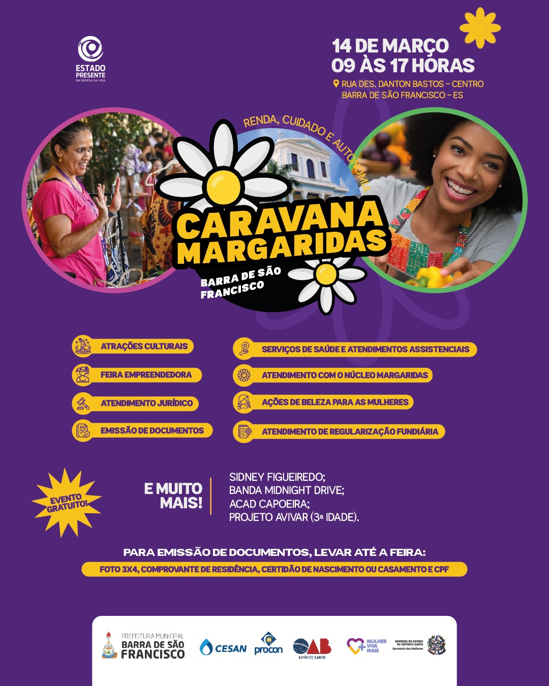 Vem aí, no próximo sábado (14), a Caravana Margaridas, um projeto da Secretaria de Estado das Mulheres, do Governo do Estado, em parceria com a Prefeitura de Barra de São Francisco. A ação acontece na Rua Desembargador Danton Bastos, no Centro, das 9h às 17h, e atenderá mulheres e adolescentes de Barra de São Francisco, além de participantes de municípios vizinhos da região Noroeste do Estado.