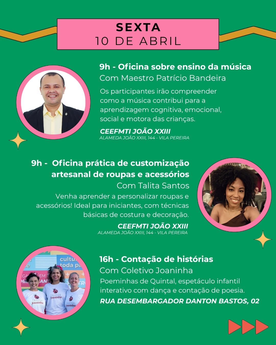 Na sexta-feira (10), a programação formativa segue no Centro Estadual de Ensino Fundamental e Médio em Tempo Integral João XXIII (CEEFMTI João XXIII), com duas oficinas simultâneas, às 9h. O maestro Patrício Bandeira ministra a oficina “Ensino da Música”, abordando a música como ferramenta no desenvolvimento cognitivo, emocional, social e motor, especialmente no aprendizado infantil. Já a instrutora Talita Santos conduz a oficina prática de customização artesanal de roupas e acessórios, com foco em técnicas básicas de costura, criatividade e geração de renda.