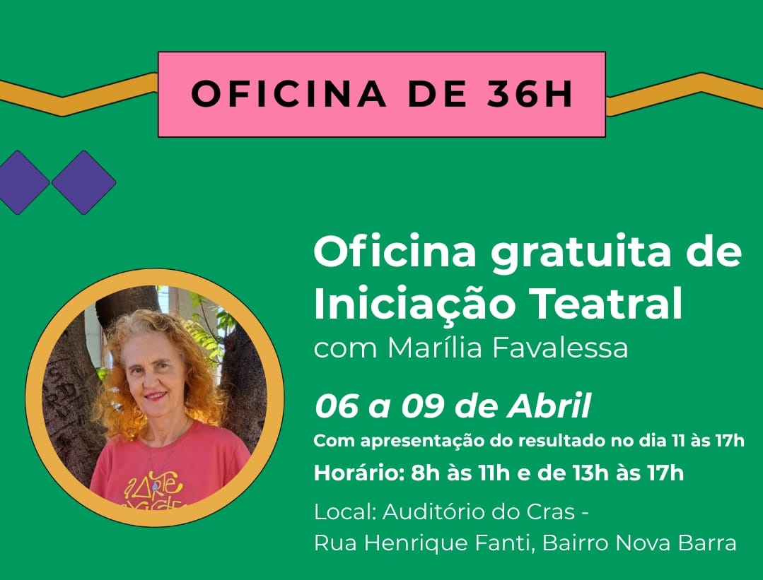 A agenda tem início, na tarde desta segunda-feira (06), com a Oficina de Iniciação Teatral, que é realizada de 6 a 9 de abril, no Centro de Referência de Assistência Social (Cras) do bairro Nova Barra. A atividade acontece em duas turmas, nos períodos da manhã e da tarde, e é conduzida pela instrutora Marília Favalessa. Ainda há vagas disponíveis, e os interessados podem efetuar as inscrições pelo formulário on-line: AQUI. Ao final da oficina, os participantes farão uma apresentação marcada para o sábado (11), às 17h, no auditório do Cras.