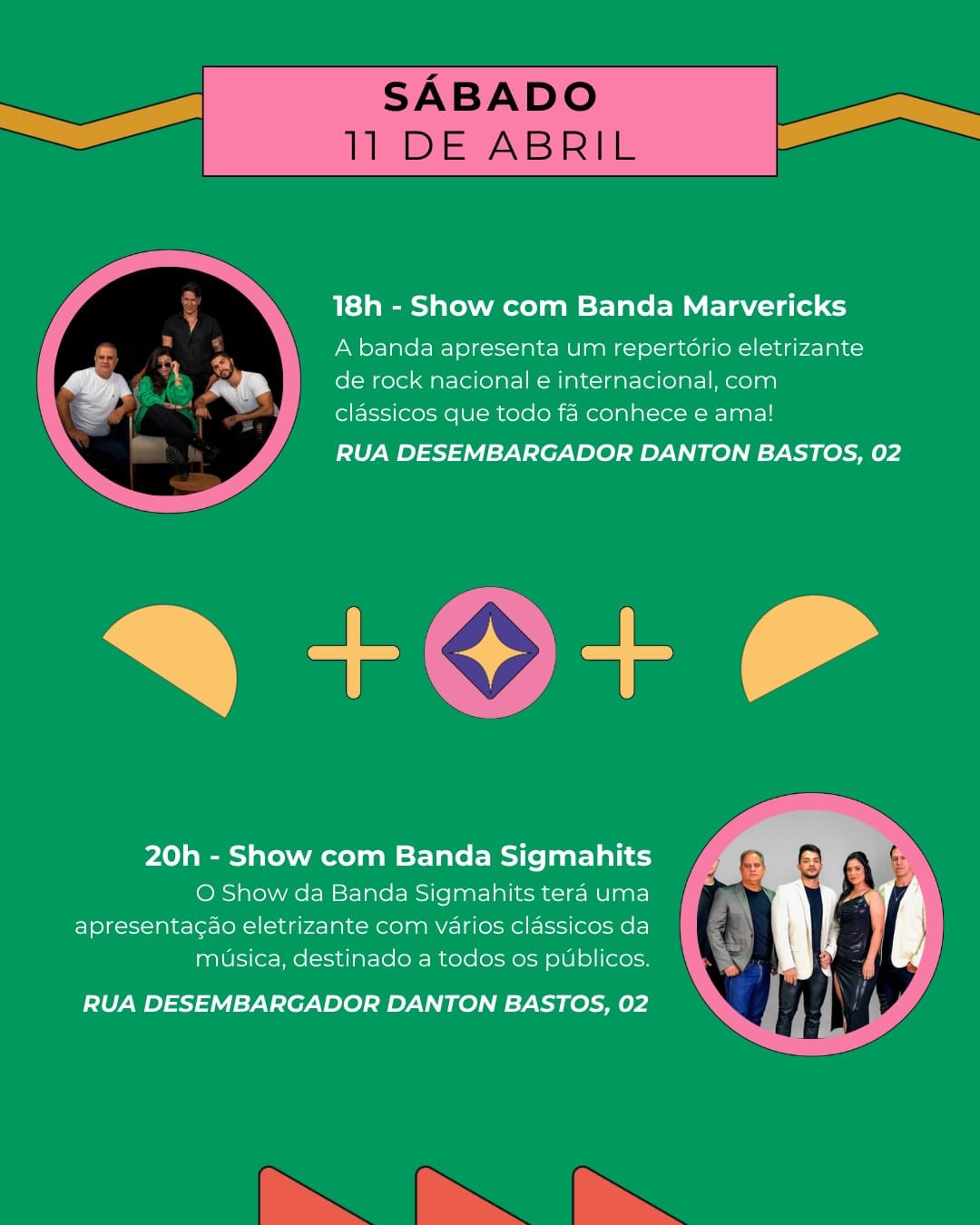 A noite segue com shows musicais: às 18h, a Banda Mavericks apresenta clássicos do rock nacional e internacional, e às 20h, a Banda Sigmahits encerra a programação com um repertório variado, acessível a todos os públicos.
