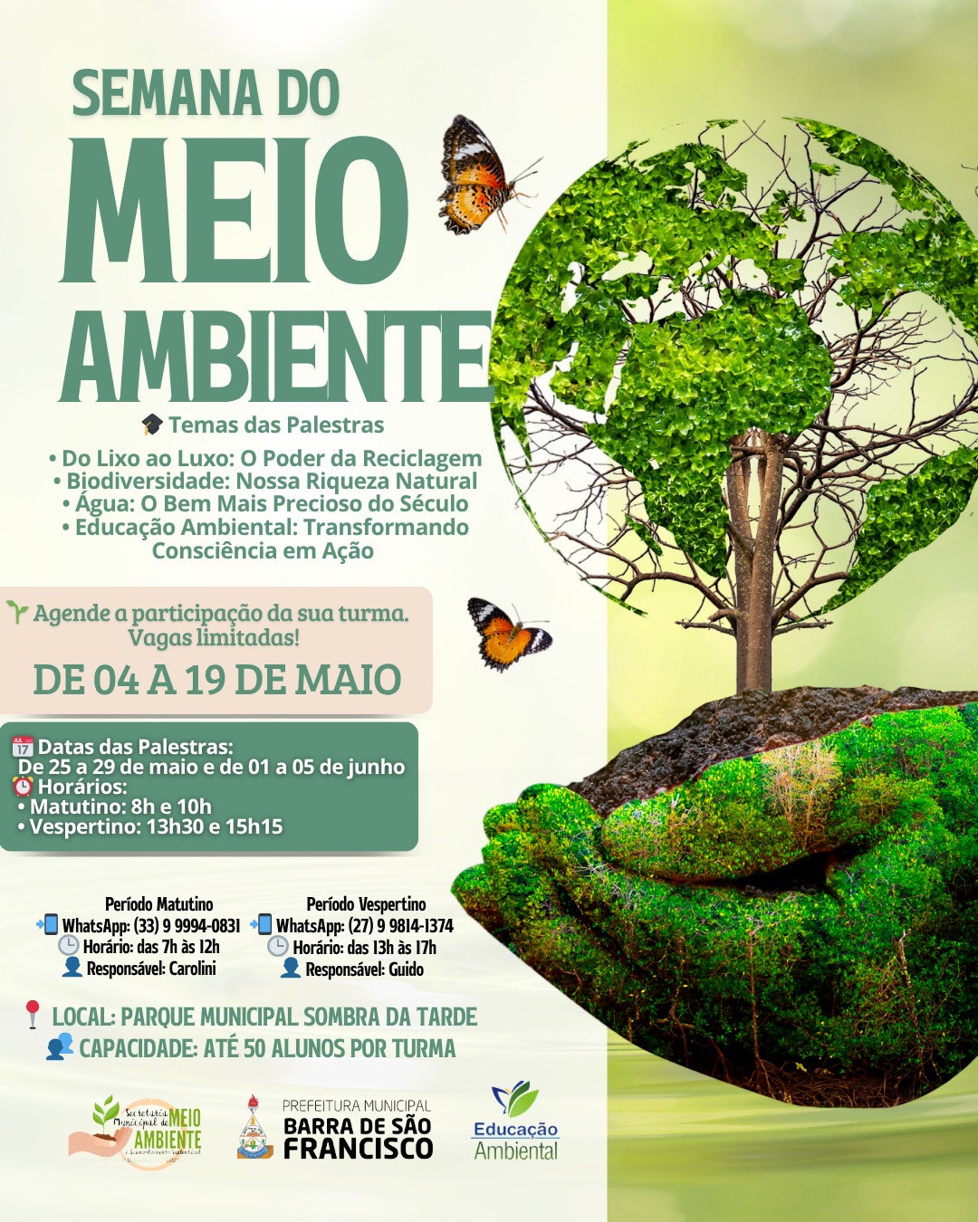 A Prefeitura de Barra de São Francisco, por meio da Secretaria Municipal de Meio Ambiente e Desenvolvimento Sustentável, promoverá uma programação especial em alusão à Semana do Meio Ambiente, com a realização de palestras educativas voltadas a estudantes da rede municipal e demais instituições de ensino.