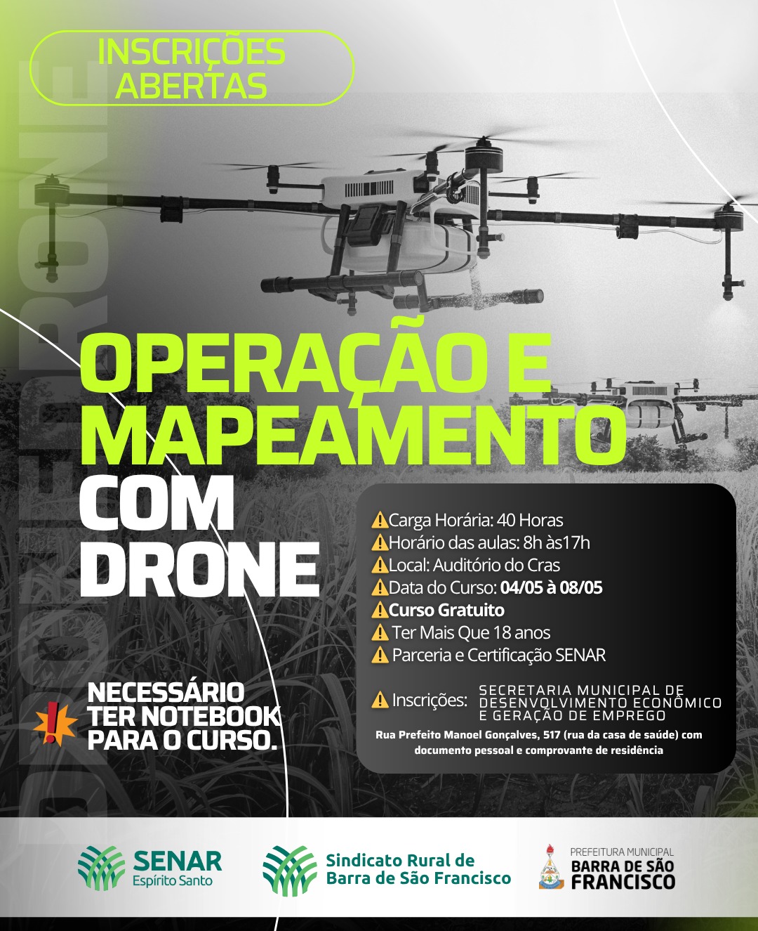 A Prefeitura de Barra de São Francisco, por meio da Secretaria Municipal de Desenvolvimento Econômico e Geração de Emprego, em parceria com o Senar Espírito Santo e o Sindicato Rural, está com inscrições abertas para o curso gratuito de Operação e Mapeamento com Drone.